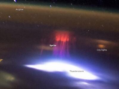 Στη διάρκεια δύο μεγάλων καταιγίδων πάνω από την αμερικανική ήπειρο, οι αστροναύτες του τροχιακού εργαστηρίου πρόλαβαν να φωτογραφήσουν δύο ηλεκτρικές εκκενώσεις γνωστές ως red sprites ή «κόκκινα ξωτικά» σε ελεύθερη απόδοση.