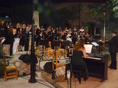Στην κατάμεστη κεντρική πλατεία των Καλαβρύτων, η Ορχήστρα και η Μικτή Χορωδία της ΠΟΛΥΦΩΝΙΚΗΣ, από κοινού με τους δύο τραγουδιστές, Χρήστο Κωνταντόπουλο και Χριστίνα Τσιμπρή, έδωσαν τον καλύτερο εαυτό τους, ερμηνεύοντας την υπέροχη μουσική των δύο πυλώνων της Νεοελληνικής μουσικής δημιουργίας.