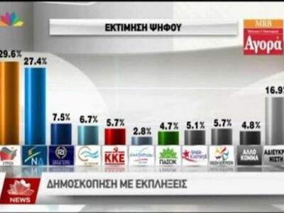 Σύμφωνα με την δημοσκόπηση της εταιρείας Marc για τον Alpha προηγείται ο ΣΥΡΙΖΑ με 25,3% έναντι της Ν.Δ με 23,2% (διαφορά δύο μονάδες).