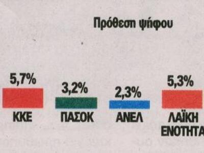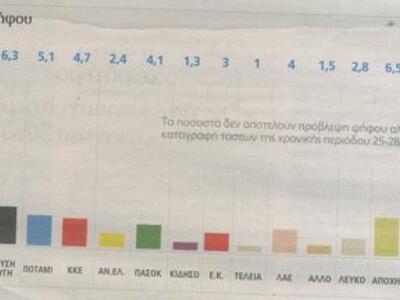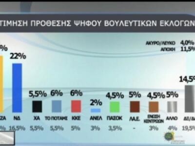 Πιο συγκεκριμένα, ο ΣΥΡΙΖΑ συγκεντρώνει ποσοστό 25% στην εκτίμηση πρόθεσης ψήφου και η ΝΔ 22. Ακολουθούν: Ποτάμι 6%, ΚΚΕ 6%, Χρυσή Αυγή 5,5%, Λαϊκή Ενότητα 5%, ΠΑΣΟΚ 4,5%, Ένωση Κεντρώων 4,5%, ΑΝΕΛ 2%.