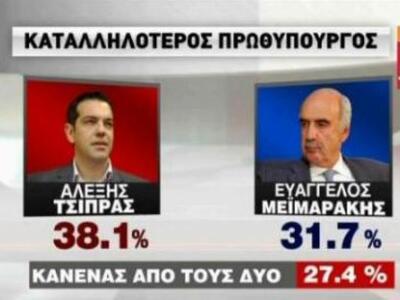 Στο ερώτημα ποιος είναι καταλληλότερος πρωθυπουργός, ο πρόεδρος του ΣΥΡΙΖΑ Αλέξης Τσίπρας συγκεντρώνει 38,1%, ενώ στην δεύτερη θέση βρίσκεται ο πρόεδρος της ΝΔ, Ευάγγελος Μεϊμαράκης.