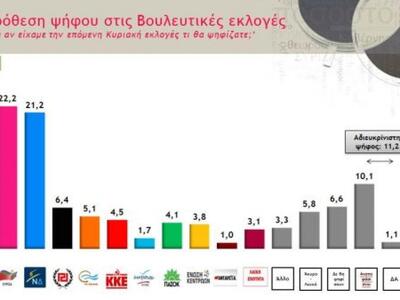 Ειδικότερα, στην πρόθεση ψήφου ο ΣΥΡΙΖΑ λαμβάνει 22,2% και η Νέα Δημοκρατία 21,2%. Ακολουθεί η Χρυσή Αυγή με 6,4%, το Ποτάμι με 5,1%, το ΚΚΕ με 4,5%, το ΠΑΣΟΚ με 4,1%, η Ένωση Κεντρώων με 3,8%, η Λαϊκή Ενότητα με 3,1%, οι ΑΝΕΛ με 1,7%. Στο 11,2% η αδιευκρίνιστη ψήφος.