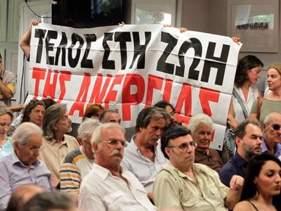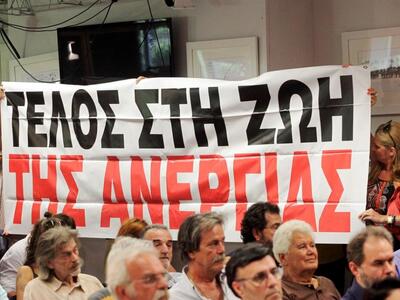 Οι εργαζόμενοι σήκωσαν το δικό τους πανό το οποίο έγραφε: «ΤΕΛΟΣ ΣΤΗ ΖΩΗ ΤΗΣ ΑΝΕΡΓΙΑΣ».