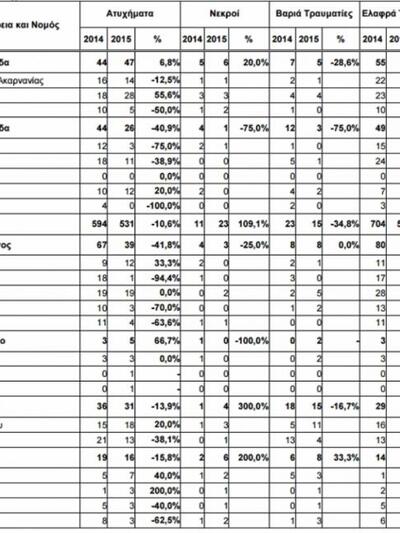 Δείτε τον πίνακα με τα τροχαία τον Ιούνιο (2014-2015) ανά περιφέρεια:
