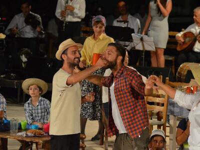 Στη συνέχεια, πάνω από 70 χορεύτριες και χορευτές κάθε ηλικίας, παρουσίασαν μια καλοδουλεμένη σύνθετη παράσταση με τραγούδια, χορούς, κείμενα, αποσπάσματα από αρχαία κωμωδία, ποίηση, δίστιχα και κυρίως ένα πολυεπίπεδο σκηνικό, από το οποίο 'παρήλασαν' όλα τα στάδια του τρύγου, το πατητήρι και ακολούθως το γλέντι με το 'ψημένο' νέο κρασί.