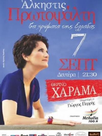 Το μουσικό ταξίδι της Άλκηστις Πρωτοψάλτη "Τα χρώματα της Ελλάδας" θα παρουσιάσουν το βράδυ της Δευτέρας 7 Σεπτεμβρίου το Θερινό Χάραμα σε συνεργασία με τον Μελωδία Πάτρας 100,4.