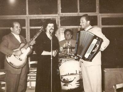 Άλλη μια ανάμνηση από την Πάτρα την παλιά. Κώστας Λογαράς-κιθάρα, Διονύσης Μυλωνάς-ντραμς, Δημήτρης Βαγενάς-ακορντεόν. Ήταν οδηγοί Ταξί και πήγαν γιά διασκέδαση. Πάτρα 1955