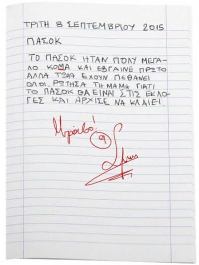 Το κείμενο χαρακτηριστικά λέει : «Το Πασόκ ήταν πολύ μεγάλο κόμμα και έβγαινε πρώτο αλλά τώρα έχουν πεθάνει όλοι. Ρώτησα τη μαμά γιατί το Πασόκ θα είναι στις εκλογές και άρχισε να κλαίει».
