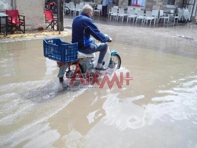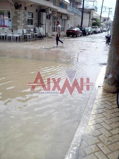 Λίγα λεπτά βροχής ήταν αρκετά ώστε ο πεζόδρομος να μετατραπεί σε λίμνη, που ακόμα και τα δίκυκλα δυσκολεύονταν να κινηθούν.