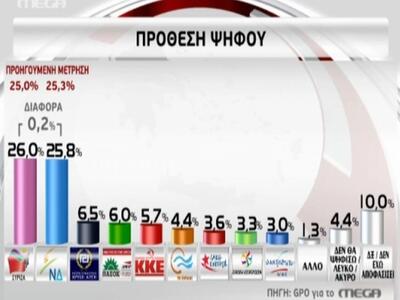 Αναλυτικότερα, σε δημοσκόπηση της εταιρίας GPO για το Mega ο ΣΥΡΙΖΑ προηγείται με 0,2% έναντι της ΝΔ.