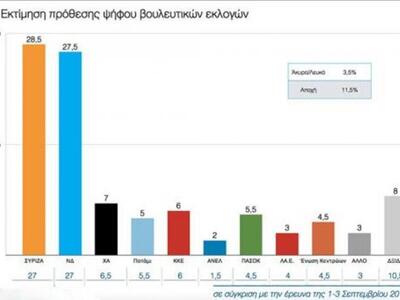 Σε απόλυτο εκλογικό «ντέρμπι» αναδεικνύεται η επικείμενη εκλογική αναμέτρηση της 20ης Σεπτεμβρίου. Σε τρεις δημοσκοπήσεις ο ΣΥΡΙΖΑ φαίνεται να έχει οριακό προβάδισμα έναντι της ΝΔ που κυμαίνεται από το 0,2% και ανέρχεται έως και 1%.