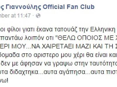 Ο Ματθαίος Γιαννούλης έκανε τατουάζ την ελληνική σημαία στο δεξί του χέρι και ανέβασε τη φωτογραφία στην επίσημη σελίδα του fan club του στο facebook, γράφοντας τα εξής: