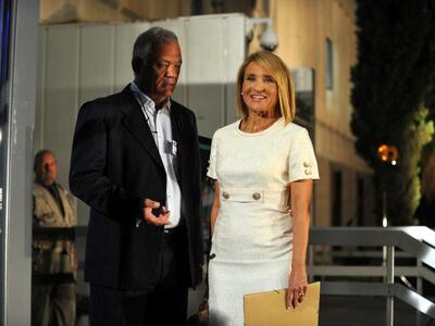Στον περίβολο του ραδιομεγάρου συνάντησε και τον Αντώνη Σρόιτερ του Alpha, ο οποίος φορούσε ένα σκούρο κοστούμι με άσπρο πουκάμισο και κατευθύνθηκαν μαζί προς τα σκαλιά.