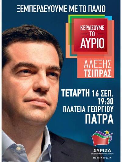 "Ο ΣΥΡΙΖΑ Αχαΐας σας καλεί, όλους και όλες, στην κεντρική προεκλογική του συγκέντρωση που θα πραγματοποιηθεί αύριο Τετάρτη 16 Σεπτεμβρίου 2015 και ώρα 19:30 στην πλατεία Γεωργίου στην Πάτρα.