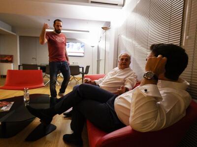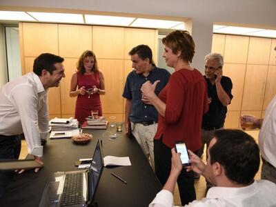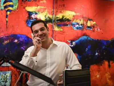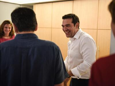 Χαλαρός, ευδιάθετος και πάντα με χαμόγελο μετά την εκλογική νίκη ο Αλέξης Τσίπρας παρακολουθεί τα τελικά αποτελέσματα των εκλογών από το γραφείο του στην Κουμουνδούρου. Στο πλευρό του πάντα η σύντροφός του Μπέτυ Μπαζιάνα.