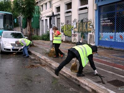 Τα συνεργεία του Δήμου δουλεύουν πυρετωδώς από το πρωί για να καθαρίσουν τους δρόμους και τα φρεάτια από τα φύλλα και τα σκουπίδια που παρέσυρε η δυνατή νεροποντή ενώ σε πολλές περιπτώσεις πολύτιμη είναι και η συμβολή των καταστηματαρχών.