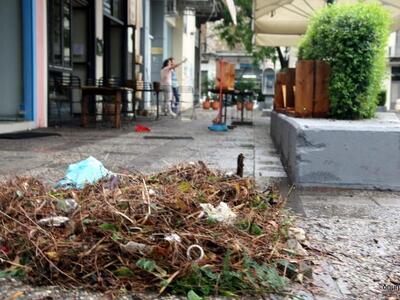 Απροετοίμαστους μας βρήκε η πρώτη καταιγίδα του φθινοπώρου. Βουλωμένα φρεάτια από φύλλα και σκουπίδια. Ακόμα και ολόκληρα κλαδιά και κορμοί δέντρων παρασύρθηκαν μπροστά από καταστήματα.