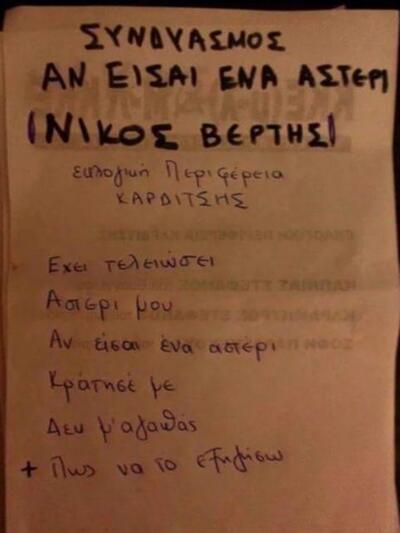 Νίκο Βέρτη και «Αν είσαι ένα αστέρι» αποφάσισε να ψηφίσει θαυμάστρια του τραγουδιστή στις εκλογές. H θαυμάστρια του Νίκου Βέρτη, που από ότι φαίνεται ανήκει στην εκλογική περιφέρεια της Καρδίτσας εγραψε, τον δικό της συνδυασμό με όνομα «Αν είσαι ένα αστέρι», την τεράστια επιτυχία του λαϊκού τραγουδιστή. Επικεφαλής του συνδυασμού ήταν φυσικά ο Νίκος Βέρτης, ενώ οι «υποψήφιοι» στην λίστα του ψηφοδελτίου ήταν τίτλοι τραγουδιών του.