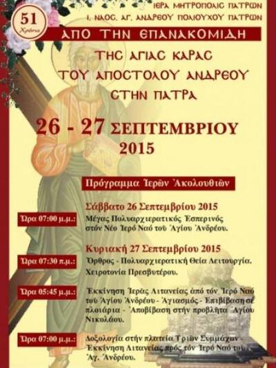 Οι εκδηλώσεις θα κορυφωθούν με την δέηση στην πλατεία Τριών Συμμάχων στις 7 το απόγευμα της Κυριακής και εν συνεχεία τη λιτανεία της Τιμίας Κάρας του Πρωτοκλήτου επί της οδού Αγίου Ανδρέου.
