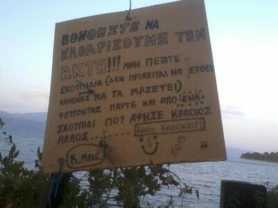 Εκεί υπάρχει και η ταμπέλα που τοποθετούν κάθε καλοκαίρι οι λάτρεις της παραλίας. Σε αυτή την ταμπέλα καλούν τους επισκέπτες να φροντίζουν για την καθαριότητα και να παίρνουν τα σκουπίδια φεύγοντας.