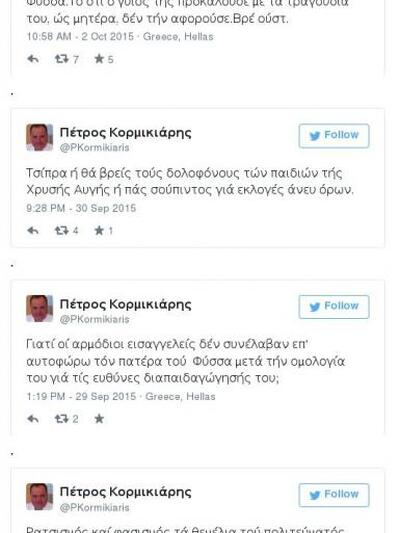 Να σημειωθεί ότι σε παλιότερες αναρτήσεις του ο κ. Κορμικιάρης καλούσε τους πολίτες να ψηφίσουν την Χρυσή Αυγή, ενώ έχει αφήσει υπόνοιες ακόμη και για τον Αλέξη Τσίπρα.