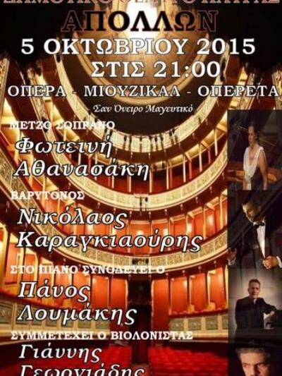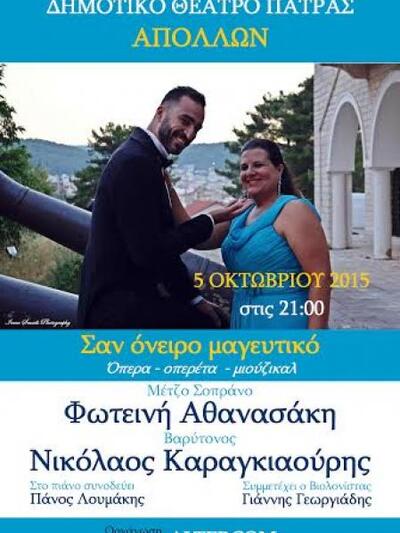 Κομμάτια γνωστά και αγαπητά από μουσικά είδη όπως μιούζικαλ, όπερα, ελληνική οπερέτα και ιταλικές καντσονέτες που θα «μιλήσουν» στο αυτί και την καρδιά των θεατών, περιλαμβάνει το πρόγραμμα της μουσικής παράστασης «Σαν Όνειρο Μαγευτικό» που θα παρουσιαστεί στη σκηνή του Δημοτικού Θεάτρου «Απόλλων» στην πλ. Γεωργίου, την Δευτέρα 5 Οκτωβρίου 2015, στις 21.00.