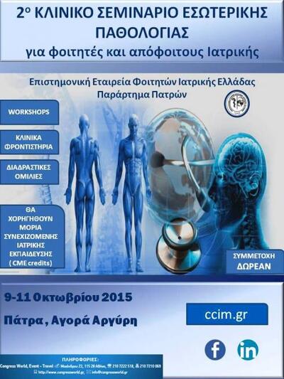 Το «2ο Κλινικό Σεμινάριο Εσωτερικής Παθολογίας για Φοιτητές και Απόφοιτους Ιατρικής», θα διεξαχθεί και φέτος στην Πάτρα, από τις 9 έως τις 11 Οκτωβρίου 2015 στο συνεδριακό και εκθεσιακό χώρο της Αγοράς Αργύρη.