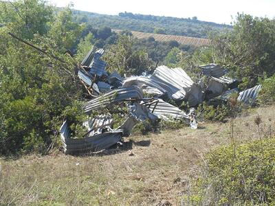 Εμβρόντητος άρχισε να αναζητά την στέγη που ήταν κατασκευασμένη από αλουμίνιο και τσίγκους, καθώς στον χώρο έξω από την αποθήκη δεν υπήρχε τίποτα. Μετά από ψάξιμο, και σε απόσταση 300 μέτρων περίπου από την αποθήκη, ο κ. Ροδόπουλος βρήκε τμήμα της στέγης το οποίο είχε στραπατσαριστεί και είχε ‘προσγειωθεί’ σε χωράφι, ενώ το υπόλοιπο κομμάτι της στέγης είχε πέσει σε χαράδρα.