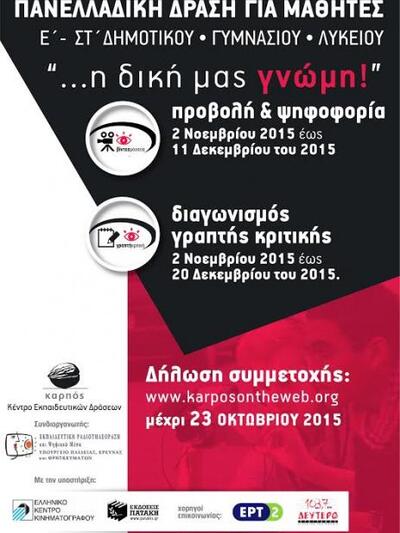 Οι εκπαιδευτικοί που επιθυμούν να συντονίσουν μια προβολή, ή οι μαθητές που θέλουν να πάρουν μέρος στο διαγωνισμό «Γραπτής Κριτικής» πρέπει να δηλώσουν συμμετοχή για τη δράση και την ψηφοφορία, έως τις 23 Οκτωβρίου 2015 στην ιστοσελίδα του «ΚΑΡΠΟΣ»: www.karposontheweb.org