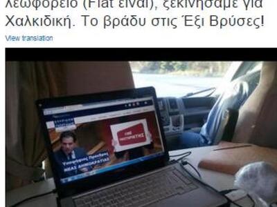 Ο Άδωνις Γεωργιάδης μάλιστα ανέβασε ακόμα μια φωτογραφία, αυτή τη φορά, μέσα από το πούλμαν- στρατηγείο, σχολιάζοντας «Μέσα από το περίφημο, "πολυτελές" λεωφορείο (Fiat είναι), ξεκινήσαμε για Χαλκιδική. Το βράδυ στις Έξι Βρύσες!».