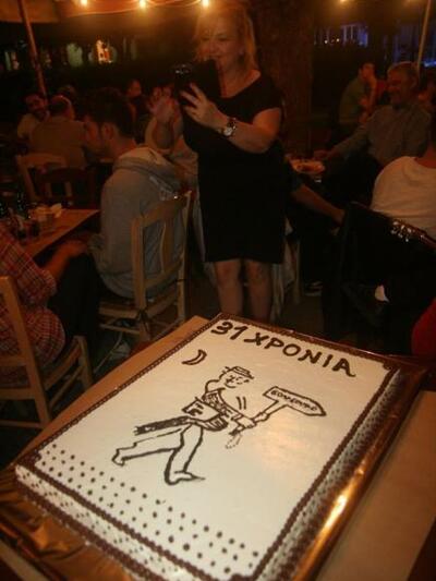 Έχοντας 31 χρόνια τραβήξει το καλό το ...χαρτί, ο Ηλίας είπε να κόψει τούρτα, η οποία ήταν μια τεράστια καρυδόπιτα με το σύμβολο του "Σούσουρου" ζωγραφισμένο πάνω στην σαντυγί. Να του ευχηθούμε άλλα 31 χρόνια, το ίδιο άστατα και ...ανάστατα και πάντα το ίδιο συντροφικά.