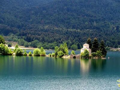 Η τεχνητή λίμνη Δόξας καθρεφτίζει τα βουνά των Αροανίων και της Κυλλήνης, με το «Παλιομονάστηρο» στο κέντρο της λίμνης να αποτελεί το «Ποντικονήσι» της Κορινθίας.