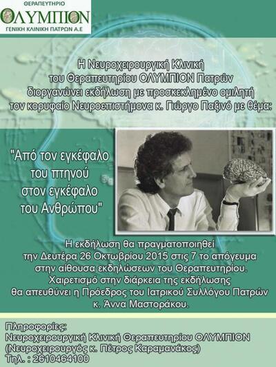 Εκδήλωση με προσκεκλημένο τον κορυφαίο έλληνα Νευροεπιστήμονα Γιώργο Παξινό, καθηγητή ψυχολογίας στο Πανεπιστήμιο της Νέας Νότιας Ουαλίας στο Σύδνεϋ, τον άνθρωπο που χαρτογράφησε τον εγκέφαλο, αρχικά των πτηνών και των αρουραίων και έπειτα τον εγκέφαλο του ανθρώπου, θα πραγματοποιηθεί στο Θεραπευτήριο ΟΛΥΜΠΙΟΝ της Πάτρας, την Δευτέρα 26 Οκτωβρίου 2015 στις 7 το απόγευμα.