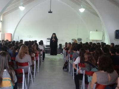"Ὁ Σεβασμιώτατος συνομίλησε μέ τούς Καθηγητάς καί μίλησε στούς Μαθητάς στή γενική σύναξη στὀ ἀμφιθέατρο τοῦ Γυμνασίου.