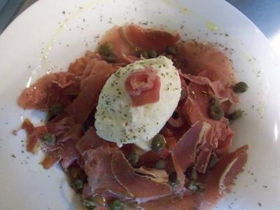 Κριθαροκούλουρο, τομάτα τριμμένη και ψιλοκομμένη, κατίκι, ελαιόλαδο, κάπαρη ή καπαρόφυλλα, ρίγανη και jamón.