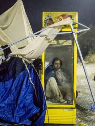 Ένας πρόσφυγας βρίσκει καταφύγιο από το κρύο και τη βροχή σε ένα ...χαλασμένο ψυγείο στην παραλία της Λέσβο.