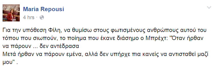 Πιο συγκεκριμένα, με ένα ποίημα του Μπρεχτ σχολίασε η πρώην βουλευτής τη δήλωση του υπουργού Παιδείας. «Για την υπόθεση Φίλη, να θυμίσω στους φωτισμένους ανθρώπους αυτού του τόπου που σιωπούν, το ποίημα που έκανε διάσημο ο Μπρέχτ: "Όταν ήρθαν να πάρουν ... δεν αντέδρασα. Μετά ήρθαν να πάρουν εμένα, αλλά δεν υπήρχε πια κανείς να αντισταθεί μαζί μου"» έγραψε η Μαρία Ρεπούση στον προσωπικό της λογαριασμό στο Facebook.