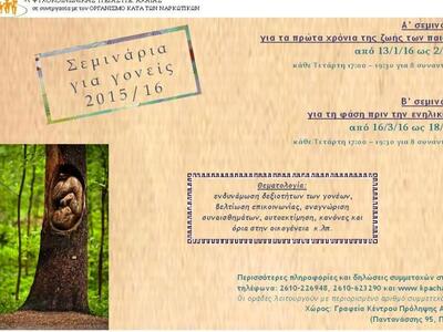 Δύο σεμινάρια για γονείς πρόκειται να υλοποιηθούν το αμέσως επόμενο χρονικό διάστημα στην Πάτρα με δωρεάν συμμετοχή από επαγγελματίες του Κέντρου Πρόληψης Εξαρτήσεων και Προαγωγής Ψυχοκοινωνικής Υγείας Αχαΐας. Τα σεμινάρια απευθύνονται σε γονείς παιδιών προσχολικής, σχολικής και εφηβικής ηλικίας, διαρκούν 8 εβδομαδιαίες συναντήσεις και θα υλοποιούνται κάθε Τετάρτη 17:00-19:30. Σε σχετική ανακοίνωση του Κέντρου, αναφέρονται τα εξής: