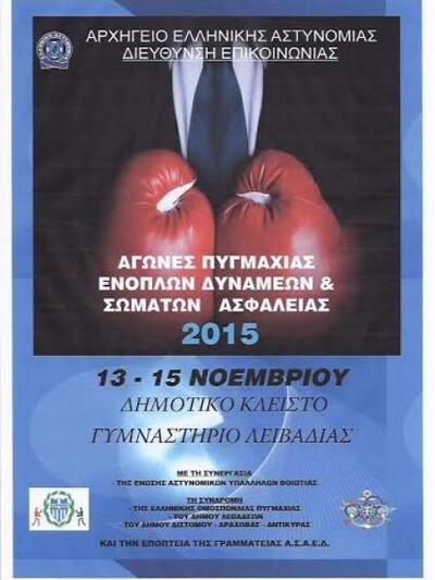 Στο Δημοτικό Κλειστό Γυμναστήριο Λιβαδειάς θα διεξαχθεί φέτος το Πρωτάθλημα Πυγμαχίας των Ενόπλων Δυνάμεων και Σωμάτων Ασφαλείας, από την Παρασκευή 13 έως Κυριακή 15 Νοεμβρίου 2015.