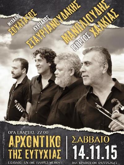Ο Σύλλογος Κρητών Πάτρας «Το Αρκάδι» ολοκληρώνει τον εορτασμό για την 149η επέτειο του Ολοκαυτώματος της Ιεράς Μονής Αρκαδίου ( 8 Νοεμβρίου 1866 ), με Κρητική βραδιά στο κέντρο «ΑΡΧΟΝΤΙΚΟ ΤΗΣ ΕΥΤΥΧΙΑΣ» το Σάββατο 14 Νοεμβρίου, με τους παρακάτω Κρητικούς μουσικούς :
