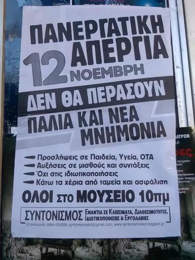 Σε ανακοίνωσή της η ΓΣΕΕ αναφέρει: «Για μας 24ωρη Γενική Απεργία και τα συλλαλητήρια στις 12 Νοέμβρη αποτελούν τη "μητέρα των μαχών" απέναντι στη νέα λαίλαπα μέτρων υποβάθμισης του επιπέδου διαβίωσης της Ελληνικής κοινωνίας. Όλοι μαζί μπορούμε να αποτρέψουμε τα χειρότερα και να ανατρέψουμε τα προηγούμενα. Όλοι και όλες μαζί αρκεί να το πιστέψουμε. Αρκεί ο καθένας και η καθεμία από εμάς να επιλέξουμε τι είδους ασφάλεια θέλουμε. Κοινωνική ασφάλεια ή ασφάλεια του καναπέ;»