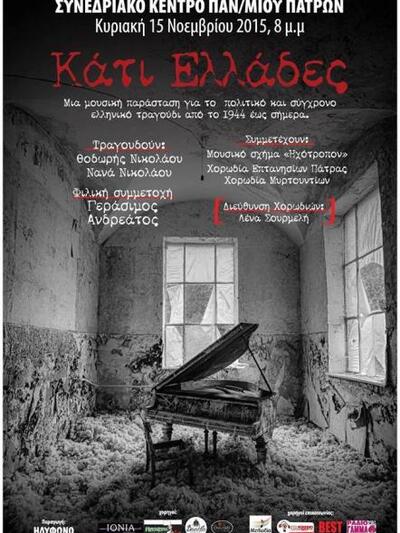 Το ΗΔΥΦΩΝΟ παρουσιάζει τη μουσική παράσταση «Κάτι Ελλάδες» στο Συνεδριακό και Πολιτιστικό Κέντρο του Πανεπιστημίου Πατρών την Κυριακή 15 Νοεμβρίου 2015 στις 8 μ.μ. Πρόκειται για μια παράσταση-αναφορά στο ελληνικό τραγούδι στην οποία συμμετέχουν: