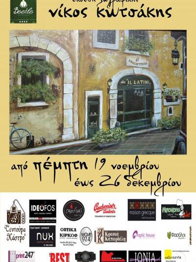 Αυτή την Πέμπτη στις 21.15 στον πολυχώρο Beetle, θα πραγματοποιηθούν τα εγκαίνια της έκθεσης ζωγραφικής του γνωστού Πατρινού ζωγράφου Νίκου Κωτσάκη.