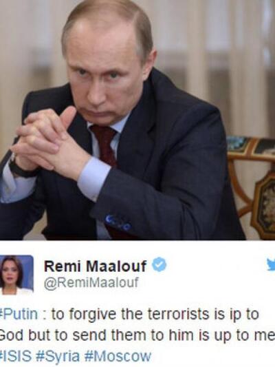 «Η συγχώρεσή τους εναπόκειται στο Θεό, αλλά το να συναντηθούν με το Θεό εναπόκειται σε μένα», φέρεται να είπε ο Ρώσος ηγέτης σύμφωνα με tweet που ανέβασε στον προσωπικό της λογαριασμό στο Twitter η παρουσιάστρια του Russian Today (RT) Remi Maalouf.