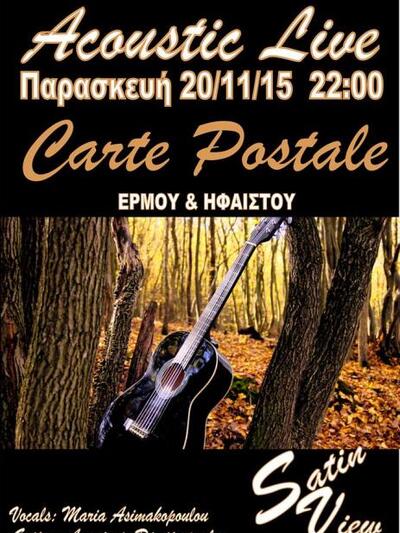 Παρασκευή βράδυ και ο καθένας δικαιούται λίγη διασκέδαση και χαλάρωση. Συντροφιά με τη μουσική λοιπόν και τους Satin View θα περάσει και αυτή η βραδιά.Δίνουμε ένα ακόμα ραντεβού στο Carte Postale, για να ακούσουμε όμορφα τραγούδια και να απολαύσουμε τις γευστικές προτάσεις του kitchen bar , το ποτό ή τη μπύρα μας.