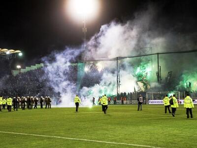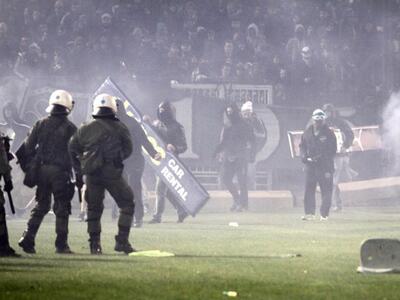 Δύο-τρεις κουκουλοφόροι παραβίασαν την πόρτα στην θύρα 13 και μπήκαν στο γήπεδο. Ο ένας κρατώντας ένα καπνογόνο κατευθύνθηκε προς την φυσούνα και το πέταξε προς τα ΜΑΤ χωρίς να τραυματιστεί κανείς. Ακολούθησε πραγματικός πανικός στις εξέδρες.