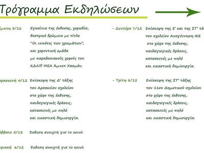 Έκθεση του Κέντρου Δημιουργικής Απασχόλησης Παιδιών Με Αναπηρία "Άμπετ Χασμάν" του Κοινωνικού Οργανισμού του Δήμου Πατρέων, πραγματοποιείται από τις 3 Δεκεμβρίου έως και 8 Δεκεμβρίου 2015 στην Αγορά Αργύρη.