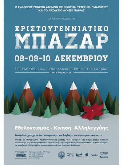 Το Αρσάκειο Γενικό Λύκειο Πατρών σε συνεργασία με τον Σύλλογο Γονέων Ατόμων με νοητική υστέρηση «Μαχητές» διοργανώνουν Χριστουγεννιάτικο Bazaar στον χώρο τού Εμπορικού και Βιομηχανικού Επιμελητηρίου Αχαΐας (Ρήγα Φεραίου 58).