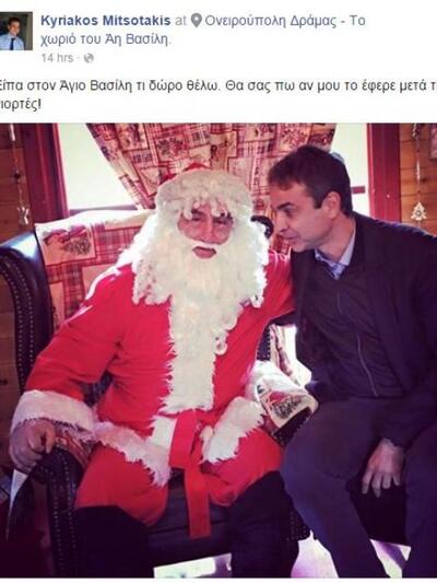 Στην Ονειρούπολη, ο κ. Μητσοτάκης φωτογραφήθηκε με τον Αι Βασίλη και ανέβασε τη φωτογραφία στο προφίλ του στο facebook. «Είπα στον Άγιο Βασίλη τι δώρο θέλω. Θα σας πω αν μου το έφερε μετά τις γιορτές», έγραψε με χιούμορ ως λεζάντα στη φωτογραφία που αγαπήθηκε πολύ από τους φίλους του.