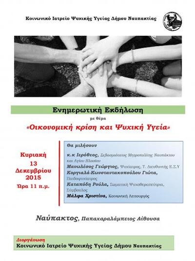 Με ιδιαίτερη ευαισθησία στα κοινωνικά θέματα αλλά και αίσθημα ευθύνης, ο Δήμος Ναυπακτίας και το Κοινωνικό Ιατρείο Ψυχικής Υγείας του Δήμου, διοργανώνουν ενημερωτική εκδήλωση με θέμα «Οικονομική κρίση και Ψυχική Υγεία» την Κυριακή 13 Δεκεμβρίου 2015 και ώρα 11 π.μ. στην Παπαχαραλάμπειο αίθουσα Ναυπάκτου.
